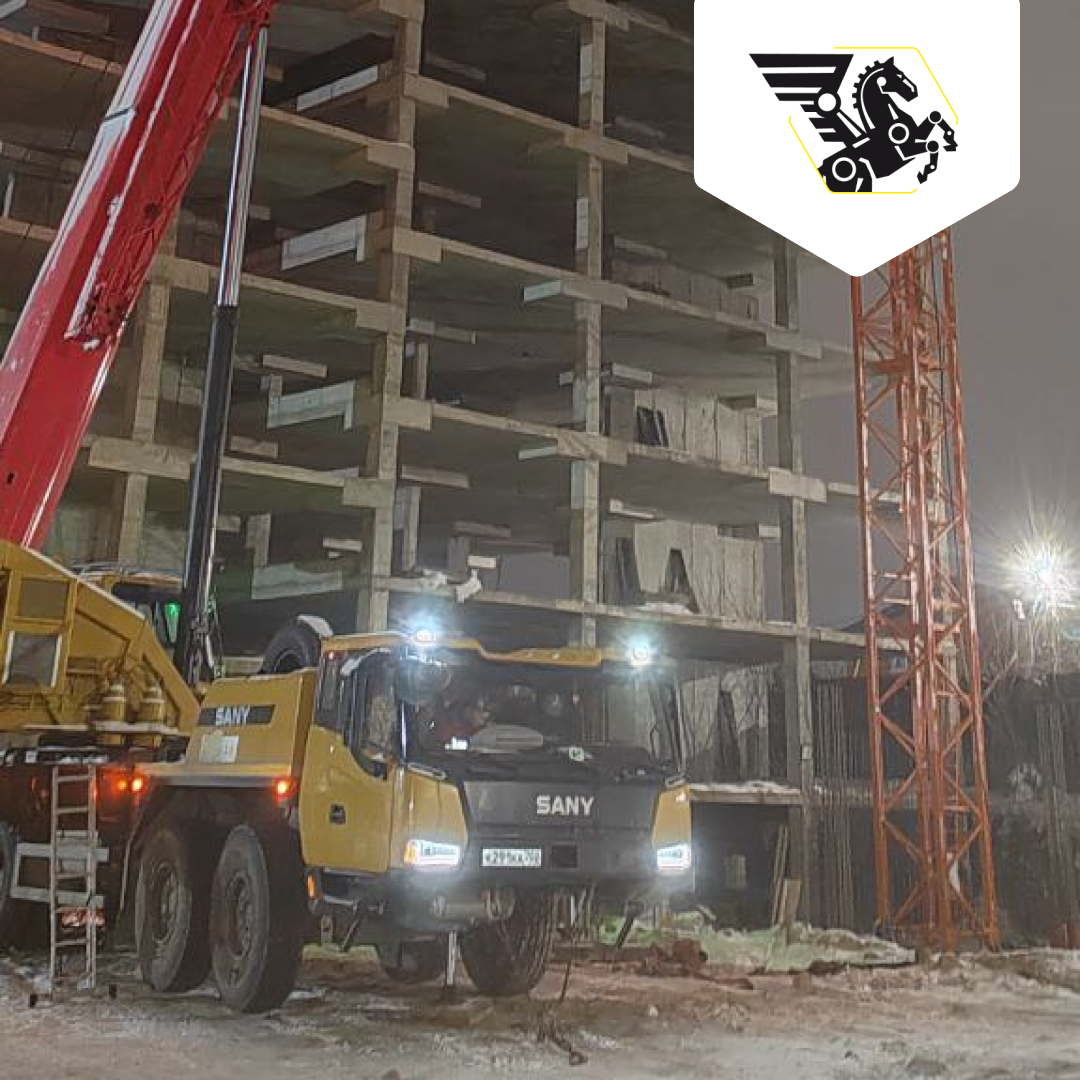 Автокран SANY STC800T5 днем и ночью в микрорайоне Алмалык-1. Здесь он помогает в монтаже башенного крана, который необходим для подъема и перемещения строительных грузов на большую высоту и расстояние при строительстве многоэтажных зданий