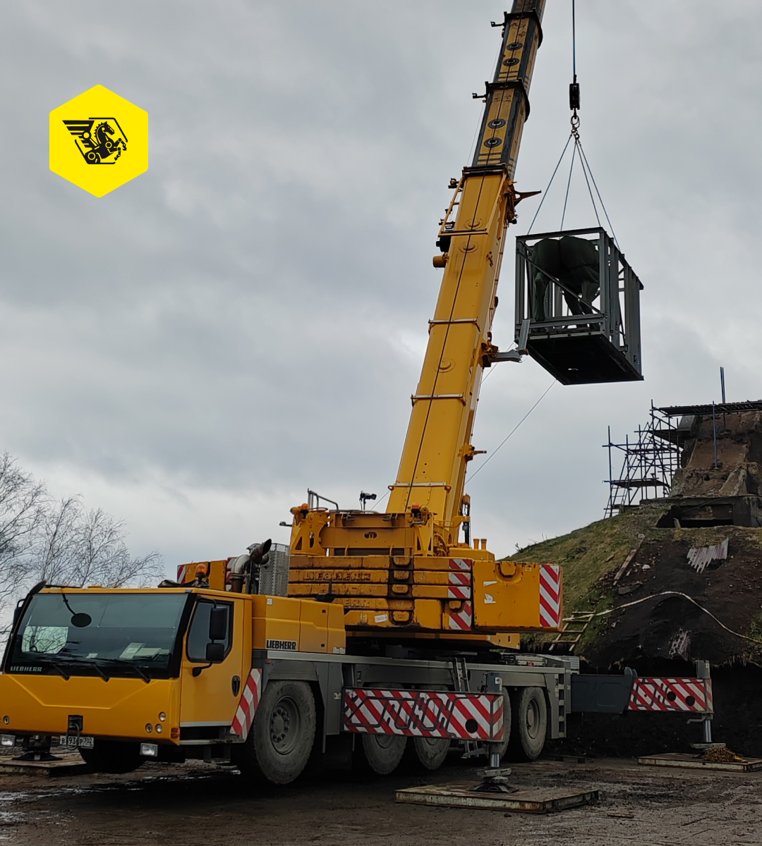 Кран Liebherr LTM 1230-5.1 завершил демонтаж конструкции – была снята самая нижняя часть памятника, вес которого составляет 17-19 тонн. Далее его перевезут в специализированный цех для дальнейшего восстановления.